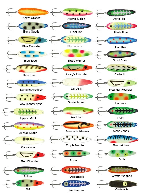 | Color | Agent Orange, Atomic Melon, Arctic Ice, Berry Seeds, Black Ice, Black Pearl, Blue Flounder, Blue Jeans, Blue Pox, Blue Toad, Bread Winner, Burnt Bread, Crab Face, Craig’s Flounder, Clyclonite, Dancing Anchovy, Do-De-K, Flounder Pounder, Glow Bloody Nose, Green Jeans, Hammer, Happee Meal, Hot Lips, Hulk, JJ Mac Muffin, Mandrain Minnow, Mean Jeans, Moonshine, Purple Nurple, Ratchet Jaw, Sliver, Soda, Sniper, Striptastic, 007, Wyatts Weapon, Blue Carbon, Carbon 14 |